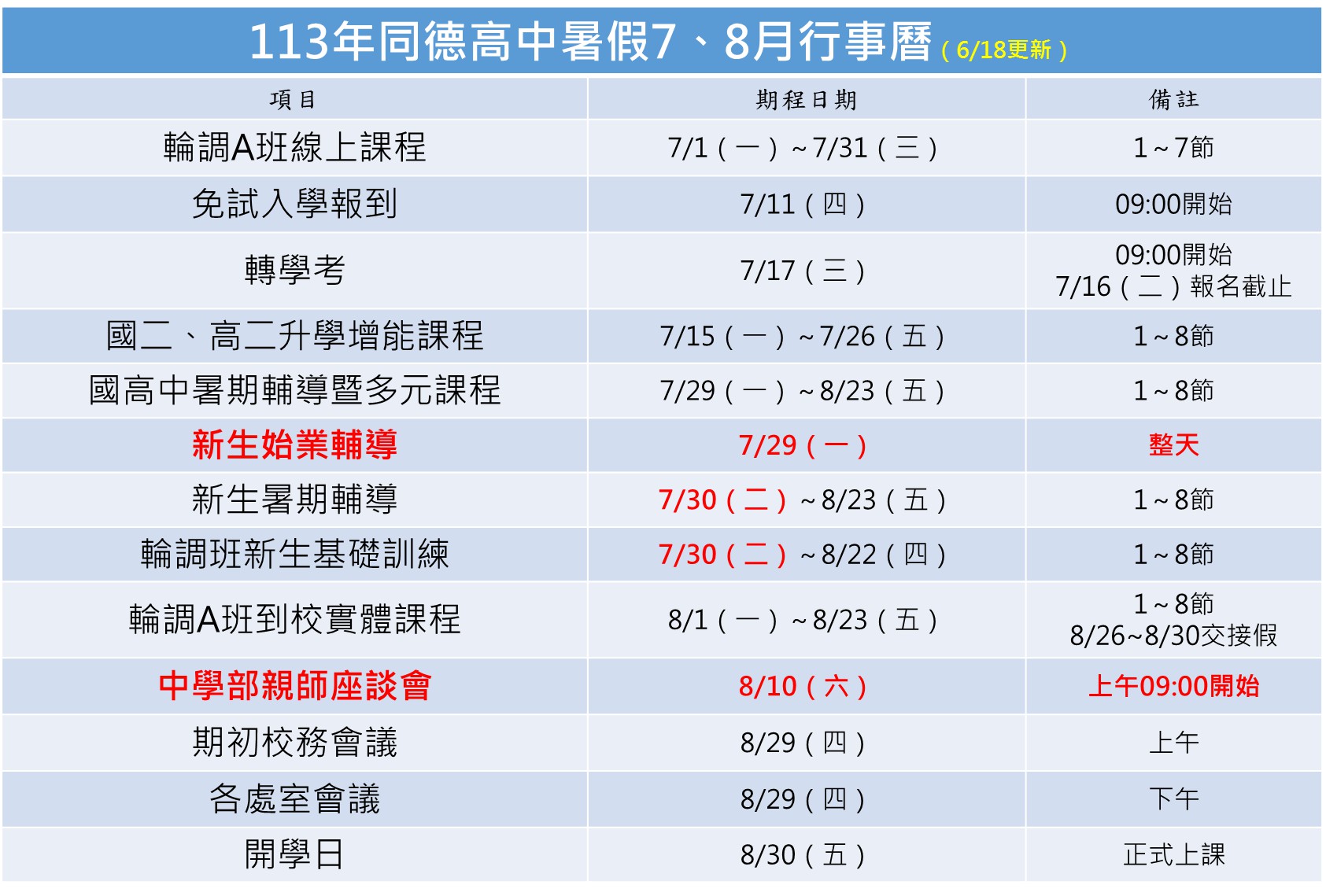 113年暑期行事曆