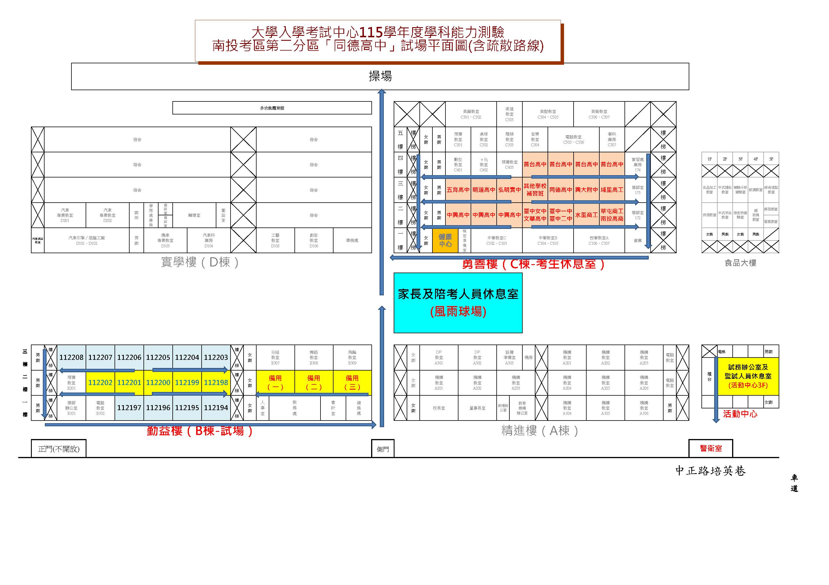 3.搭乘學校專車到南投考區第二分區車輛,請將車輛開至學校正門,考生於正門下車後,步行至側門進入考區。
